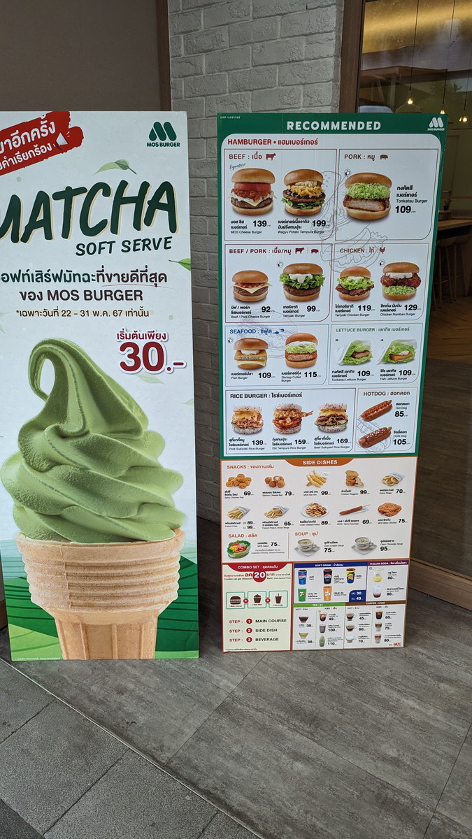 シラチャ 日本食 モスバーガーを発見 2024年5月29日 日本円/タイバーツ現在の為替レート 日本円表記をやめました。"B100"と書いてある場合、↑の表、4.abxxでしたら、掛け算し約4ab円ということです。 シラチャのセントラルでモスバーガーがあったので思わず入ってしまった。 日本と変わらぬ味。うまかった。